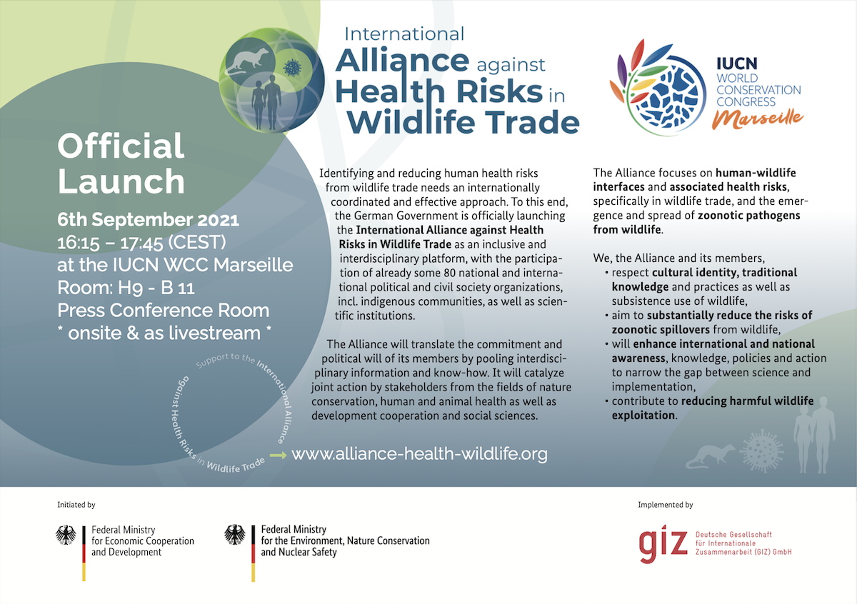 The International Alliance against Health Risks in Wildlife Trade, initiated by the German Federal Ministry for Economic Cooperation and Development and the German Federal Ministry for the Environment, Nature Conservation and Nuclear Safety, was officially launched at a press conference on 6th September at the IUCN Congress. Representatives of member organizations, the professional community and interested organizations are invited to attend the ceremony.
