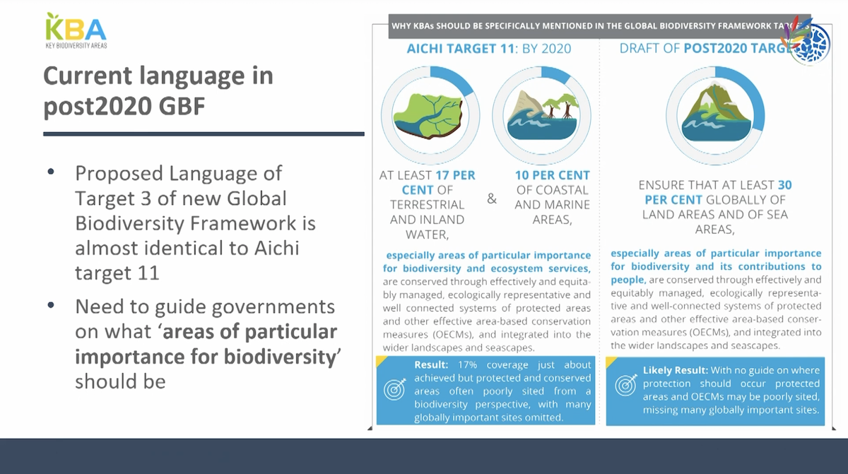This session on Key Biodiversity Area conservation in a post-2020 world, held on 6th September 2021, focused on the importance of identifying Key Biodiversity Areas (KBAs) nationally. It showed why mapping KBAs will contribute to more effective and efficient conservation, and encourage countries around the world to engage in KBA assessments and how they contribute to the implementation and outcomes of a post 2020 agenda.