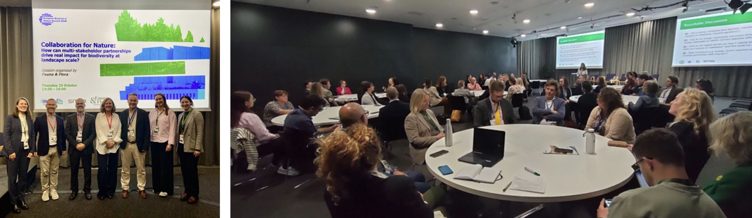 Left: Speakers at the session on “Collaboration for Nature”. Right: the audience at EBNS 2025 in Helsinki