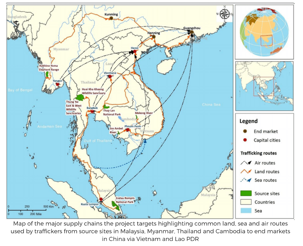 The action implemented a set of activities along clearly defined supply chains for high priority Asian taxa being trafficked in the Greater Mekong and Malaysia along trade routes between source sites to end markets. It worked with six protected areas identified as high priority for tigers, Siamese rosewood or Asian elephant in Malaysia (Endau Rompin National Park), Thailand (Huai Kha Khaeng, Thung Yai East and Thung Yai West Wildlife Sanctuaries and Thap Lan National Park) and Myanmar (Rakhine Yoma Elephant Range Protected Area), as well as two priority wetland KBAs for freshwater turtles in Cambodia along the Mekong and Sre Ambel Rivers. The action focused its anti-trafficking interventions in key localities in Thailand, Malaysia, Vietnam, Cambodia, Lao PDR, and China.